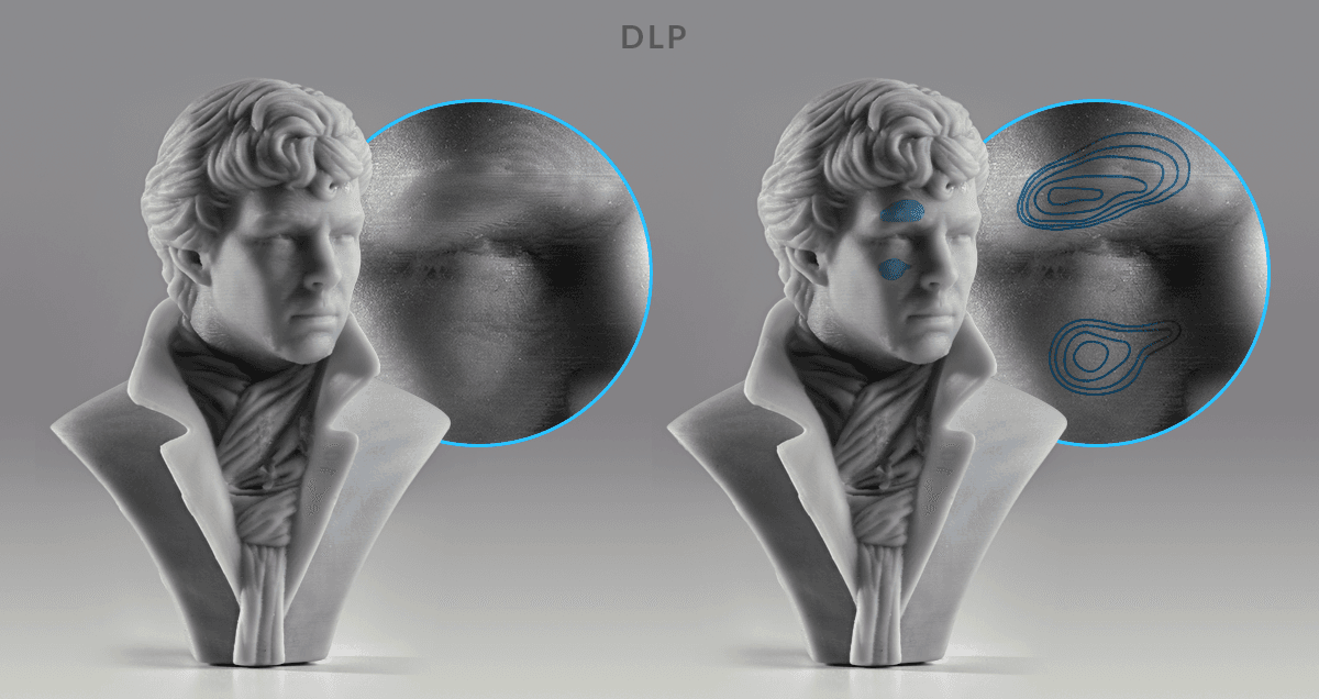 After the print is done, 3D-printed DLP parts will have excess liquid resin that has to be removed. Depending on the detailing of the print, small crevices and holes may make the print difficult to clean. Generally, dealing with liquids makes the process messier and more time-consuming. Additional time will also be required to remove supports. Due to the way DLP parts are printed, the surface comes out ‘boxy’. To achieve a better surface finishing and surface roughness, like that of SLA 3D printed part, you will need additional processes to achieve a similar finish.
